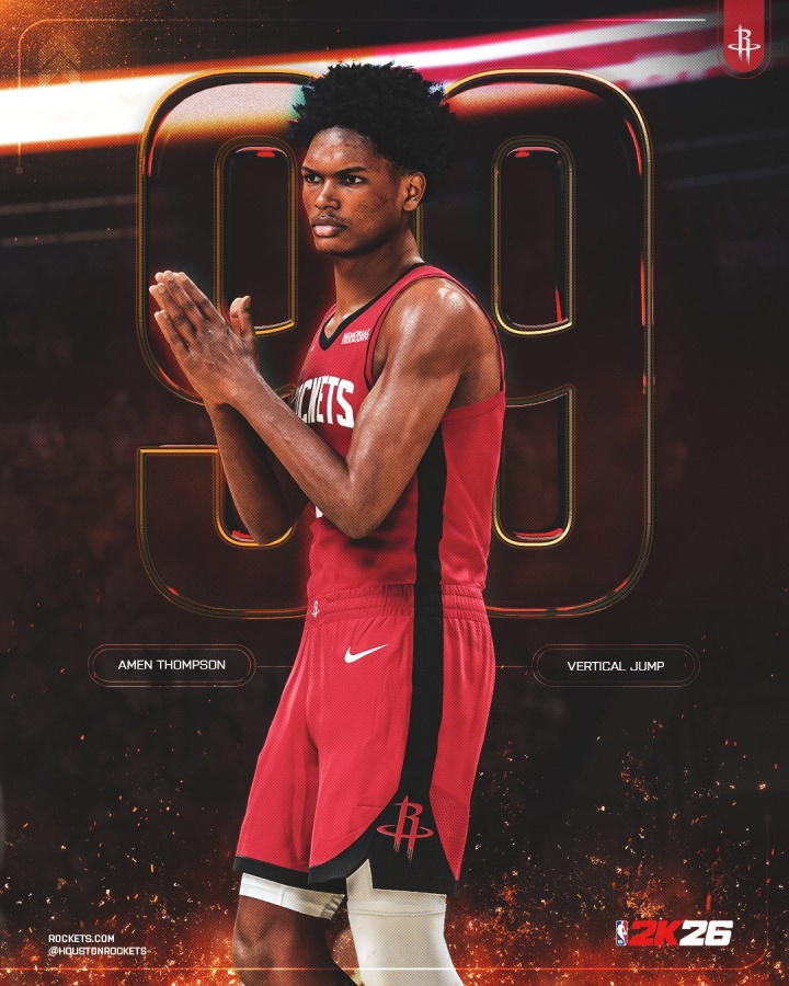 09月06日訊 火箭官方社媒今日曬出一張圖,阿門-湯普森是NBA2K26中唯一一個垂直彈跳能力值99的球員,也是最高的。