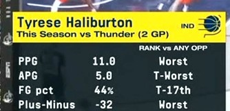 據(jù)統(tǒng)計,本賽季步行者核心哈利伯頓面對雷霆場均僅得到11.0分3.0籃板5.5助攻,投籃命中率44%,正負值-32,其中場均得分和正負值為面對任何一支球隊最糟糕。