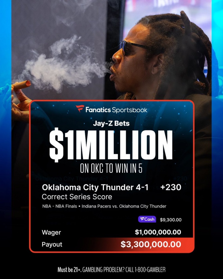 據(jù)記者Prince J. Grimes報道,說唱大亨、著名音樂制作人、商人Jay-Z在博彩網(wǎng)站Fanatics重金押注雷霆4:1奪冠,下注金額高達(dá)100萬美元。