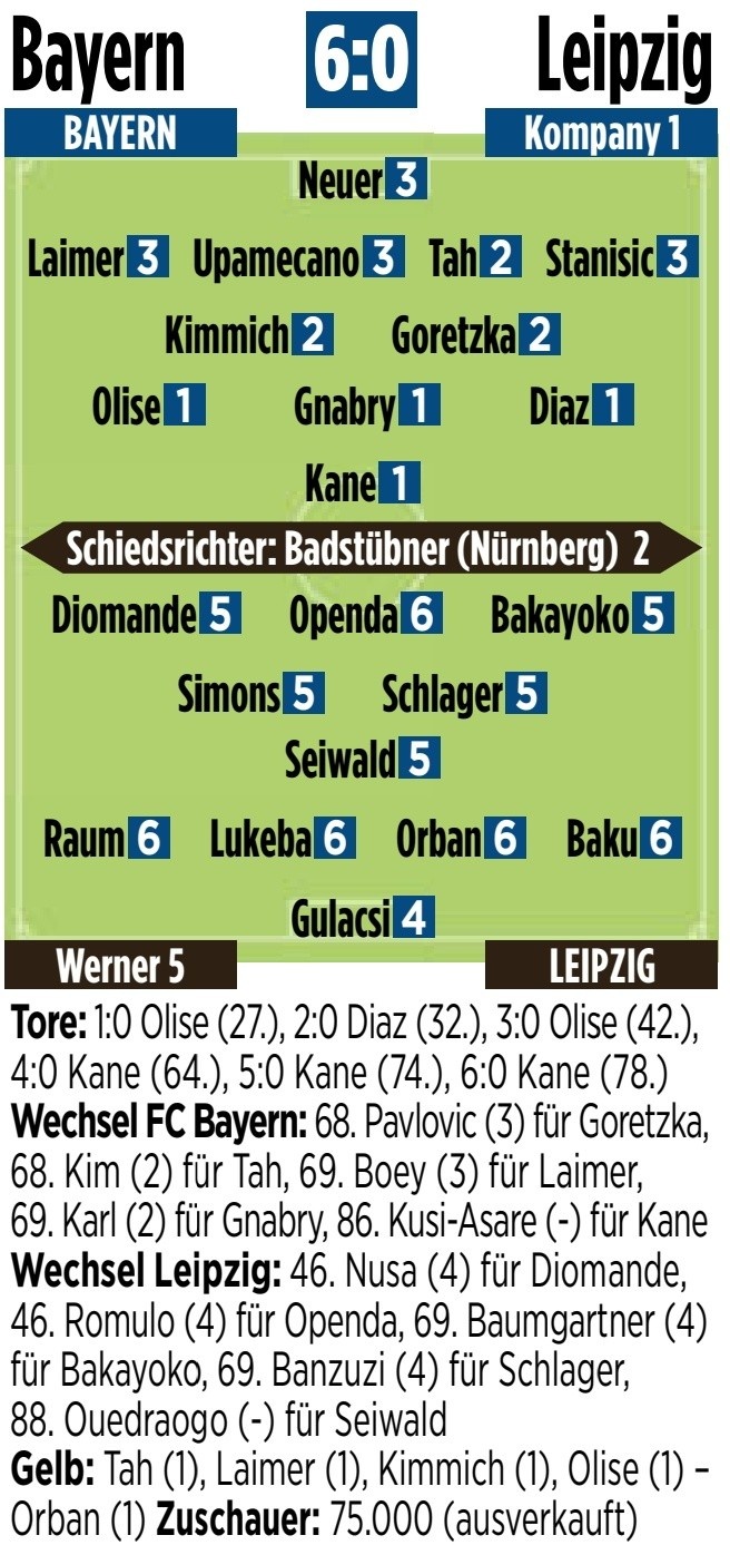 8月23日訊 德甲首輪比賽,拜仁主場(chǎng)6-0擊敗萊比錫,《圖片報(bào)》對(duì)兩隊(duì)球員和教練進(jìn)行了評(píng)分,凱恩、迪亞斯、格納布里、奧利塞1分最高。