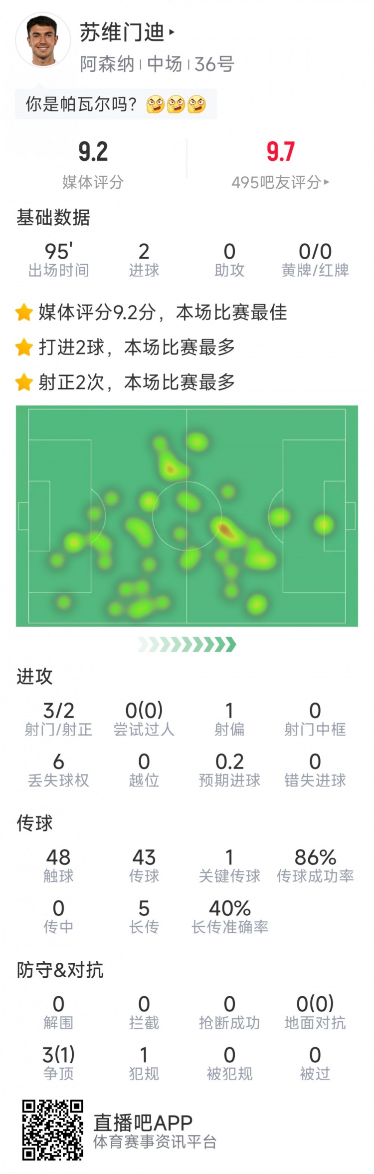 9月13日訊 在本輪英超,阿森納3-0大勝諾丁漢森林,蘇維門迪梅開二度,以下為他在本場數(shù)據(jù):