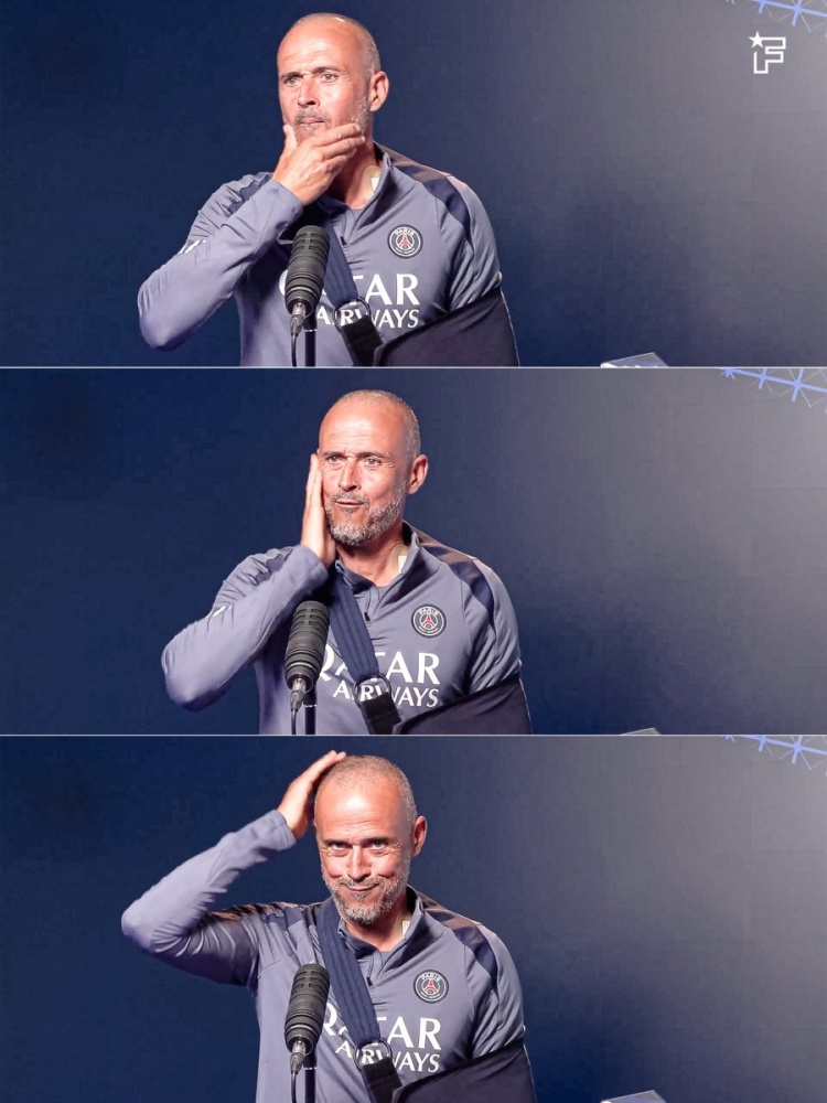 9月13日訊 在巴黎的新聞發(fā)布會上,遭遇自行車事故的恩里克手打吊帶亮相。