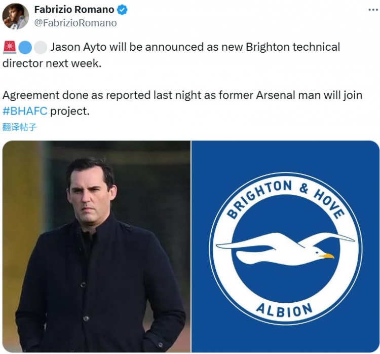 9月13日訊 據(jù)知名記者羅馬諾報(bào)道,杰森-艾托將在下周被任命為布萊頓新任技術(shù)總監(jiān)。