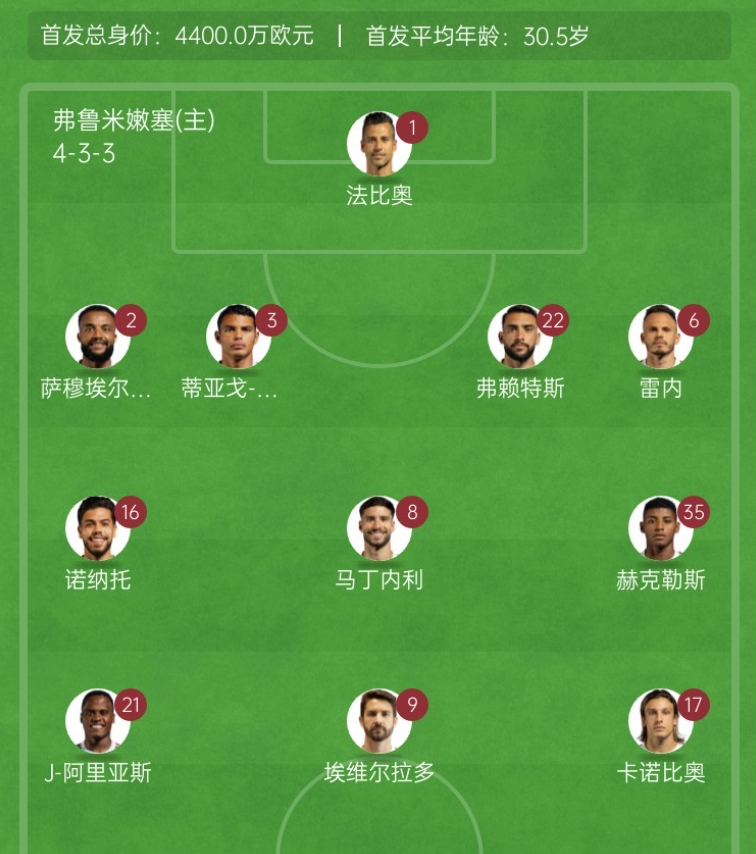 本場比賽弗魯米嫩塞排出了一條大齡首發(fā)后防線,首發(fā)門將法比奧馬西爾44歲,后衛(wèi)薩穆埃爾-哈維爾35歲、蒂亞戈-席爾瓦40歲、雷內(nèi)32歲,最年輕的福萊特斯25歲,5人平均年齡達(dá)到了35.2歲。
