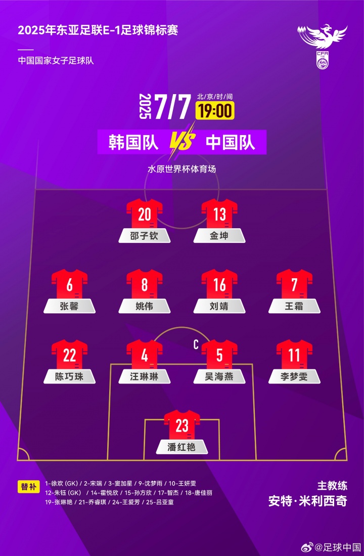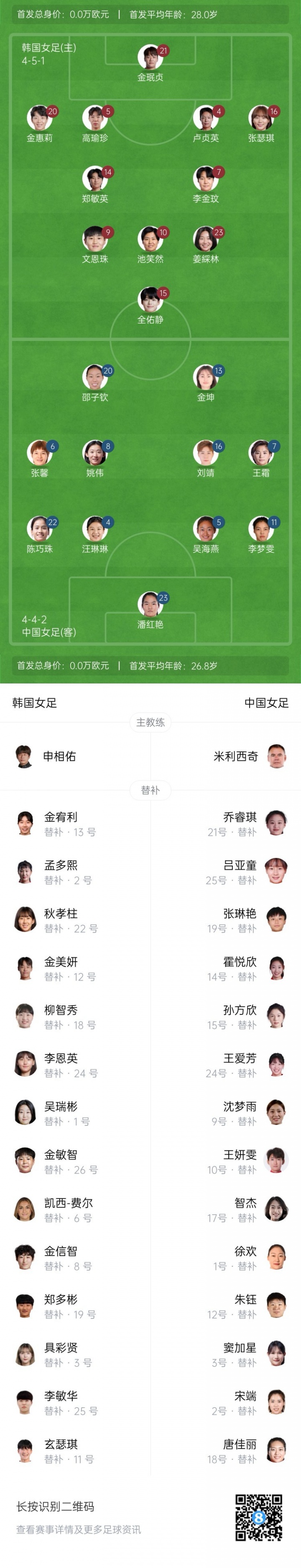 韓國女足首發(fā):21-金珉貞、4-盧貞英、5-高瑜珍、16-張瑟琪、20-金惠莉、7-李金玟、14-鄭敏英、10-池笑然、23-姜綵林、15-全佑靜、9-文恩珠