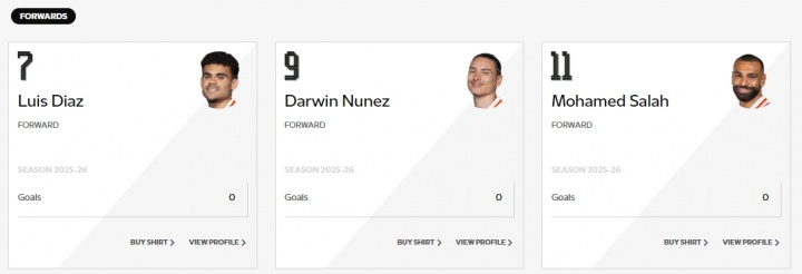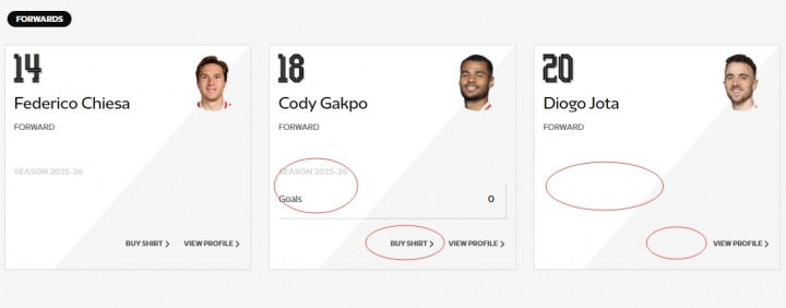 利物浦官網(wǎng)的球員列表,仍保留若塔的資料,但是僅有簡(jiǎn)介,沒有數(shù)據(jù)顯示和球衣購買選項(xiàng)。