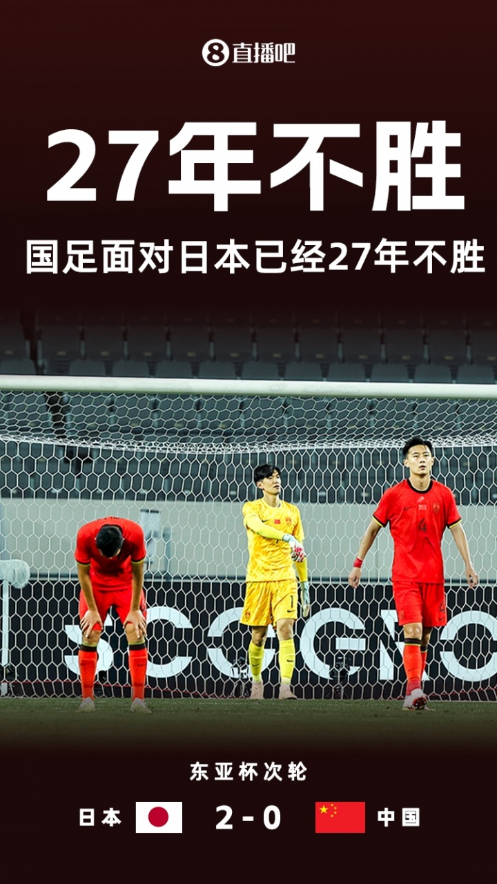 自1998年3月的戴拿斯杯(東亞杯前身)國足2-0日本以來,中國男足已經(jīng)17場不勝日本,期間總戰(zhàn)績?yōu)?平11負。