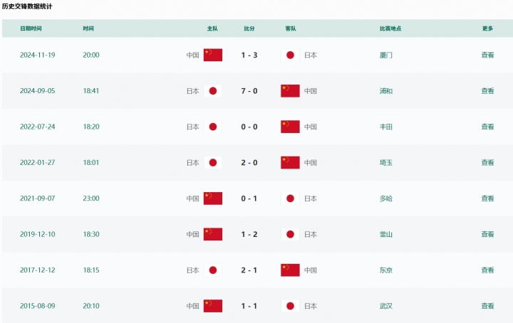 本場比賽之前,國足對陣日本連續(xù)16場不勝(數(shù)據(jù)來源:中國足協(xié)官網(wǎng))