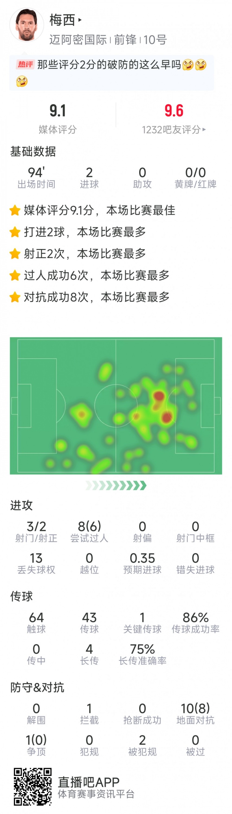 7月13日訊 在本輪美職聯(lián),邁阿密國際2-1擊敗納什維爾,梅西梅開二度,以下為梅西全場數(shù)據(jù):