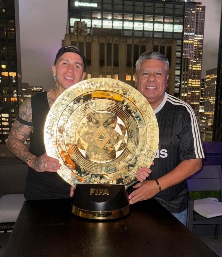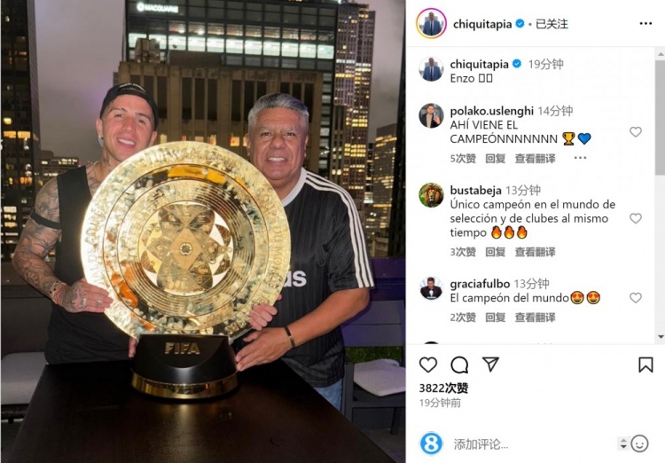 阿根廷足協(xié)主席塔皮亞現(xiàn)場觀看了這場比賽,賽后他與恩佐手捧世俱杯獎杯合影,塔皮亞在社交媒體上曬出照片。