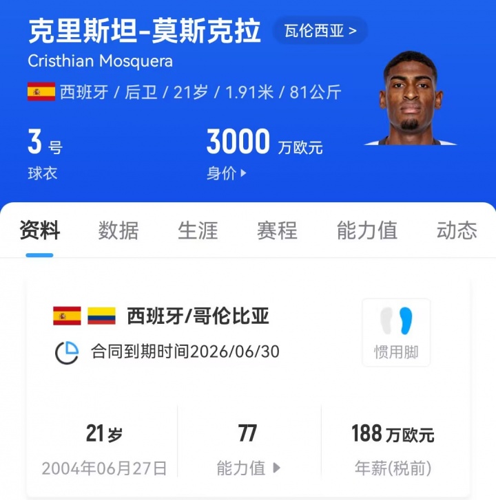 由于球員與瓦倫西亞的合同將在一年后到期,阿森納得以用較低的價格簽下球員?,F(xiàn)年21歲的莫斯克拉目前的德轉(zhuǎn)身價為3000萬歐元。