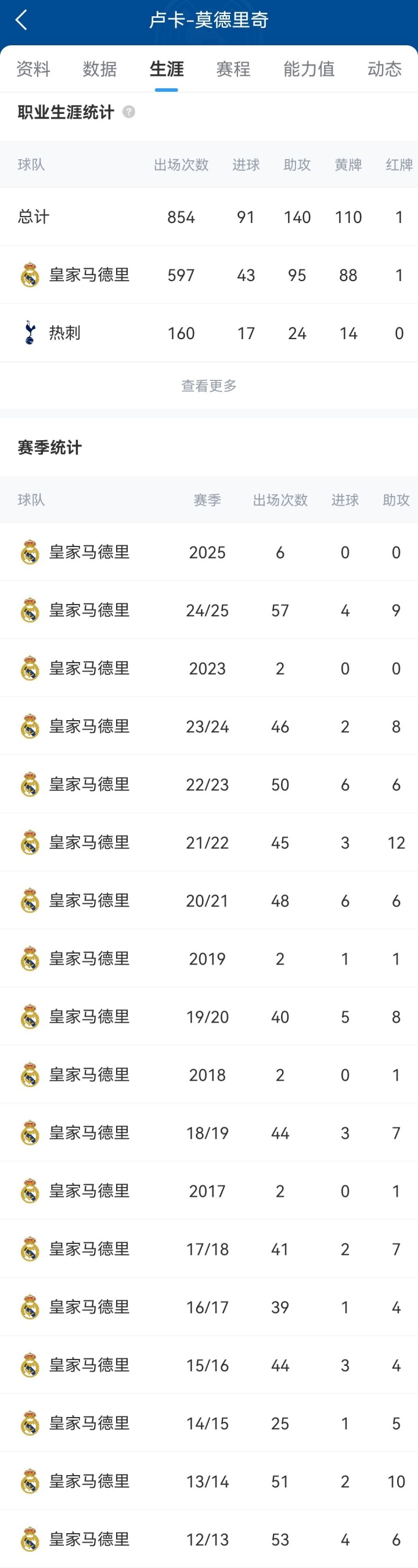 莫德里奇于2012年加盟皇馬,效力13年共出戰(zhàn)597場,打進43球助攻95次,幫助球隊奪得28座冠軍獎杯:6次歐冠、6次世俱杯、5次歐洲超級杯、4次西甲聯(lián)賽、2次國王杯和5次西班牙超級杯,并于今夏世俱杯后自由身離隊。