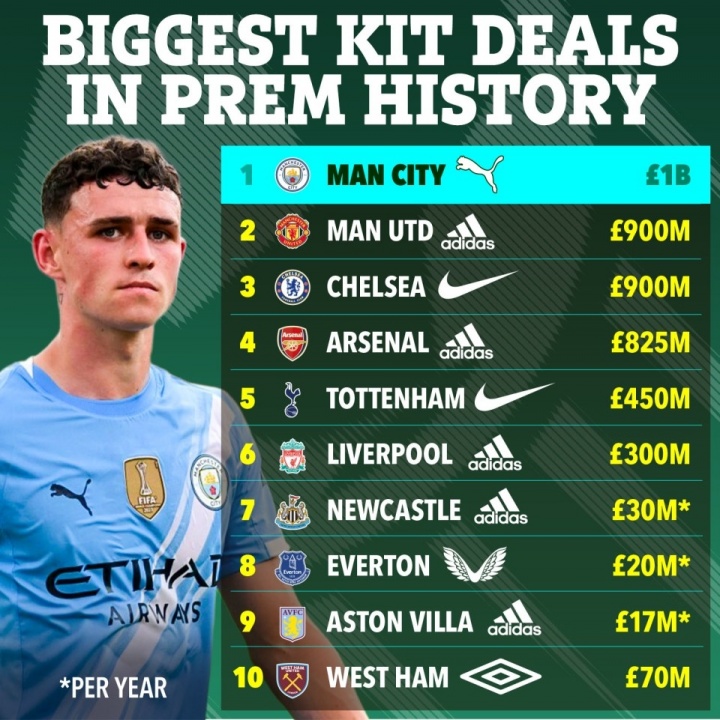 曼城的這份合同也超越了曼聯(lián)與阿迪達(dá)斯簽訂的10年9億英鎊合同,以及皇馬與阿迪達(dá)斯的8年9.5億英鎊,成為足壇歷史最大的球衣贊助合同。