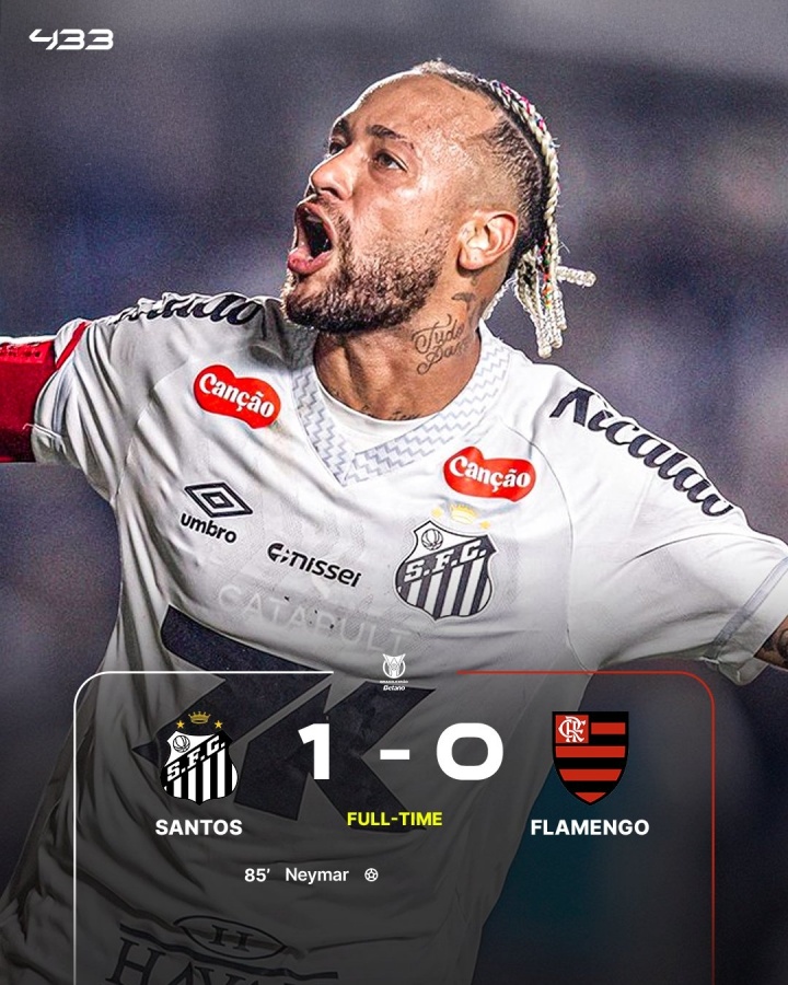 33歲內(nèi)馬爾本場(chǎng)比賽首發(fā)出戰(zhàn),第84分鐘內(nèi)馬爾禁區(qū)內(nèi)接球轉(zhuǎn)身破門,貢獻(xiàn)絕殺!桑托斯最終1-0擊敗弗拉門戈。