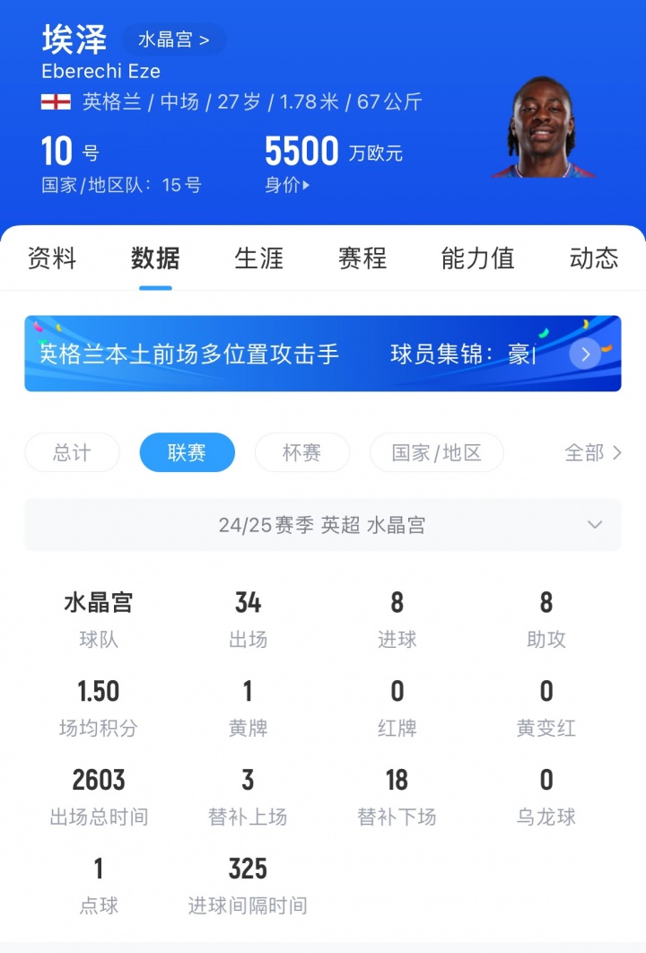 埃澤上賽季為水晶宮出戰(zhàn)43場比賽,打進(jìn)14球,助攻11次,他與水晶宮的合同將在2027年到期。
