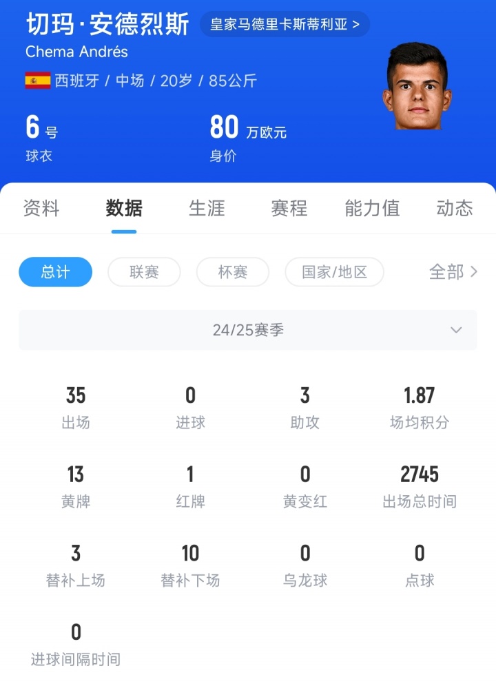 西班牙中場切瑪出生于2005年4月25日,司職中場,2024-25賽季,他代表皇馬一線隊出戰(zhàn)過2場西甲聯(lián)賽和1場國王杯比賽,均是替補登場。