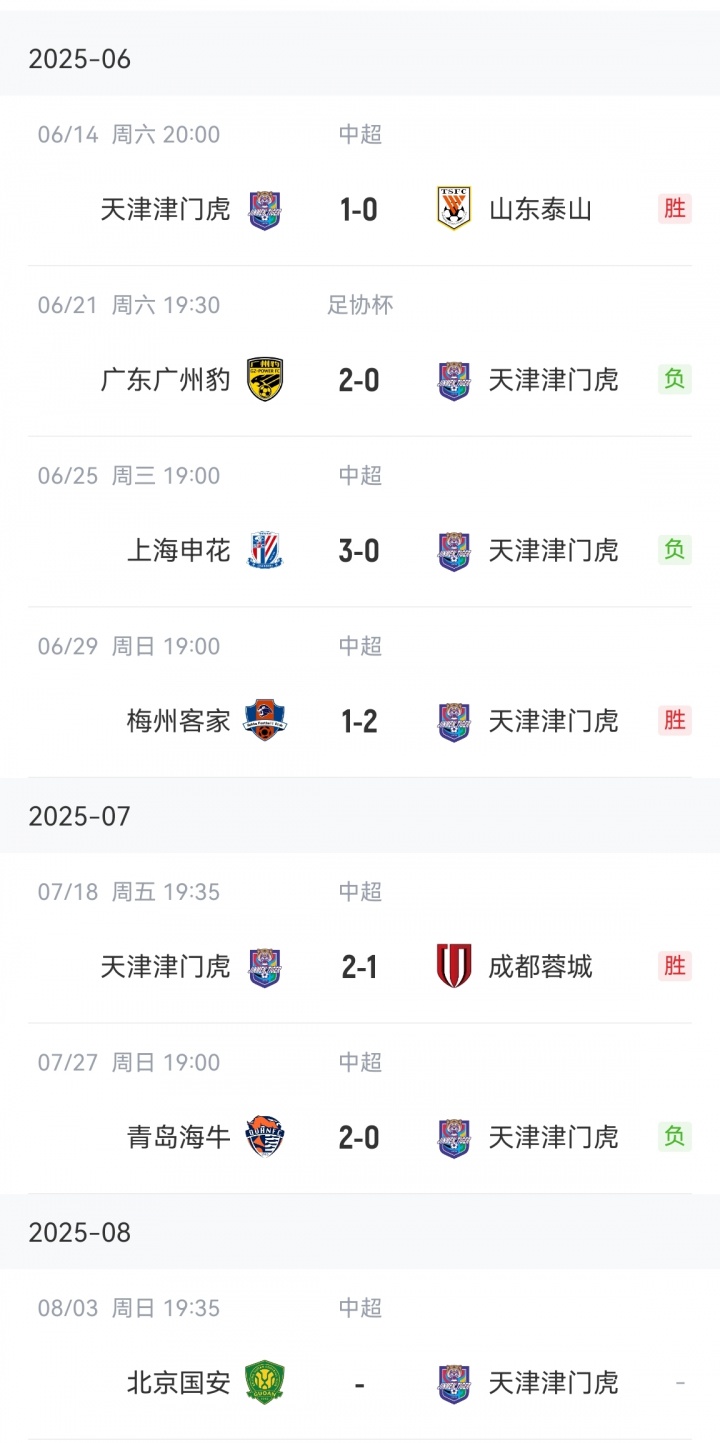 此前6月14日津門虎1-0泰山,隨后球隊(duì)在足協(xié)杯0-2輸給了中甲球隊(duì)廣州豹。