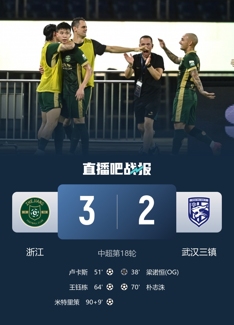 下半場(chǎng)補(bǔ)時(shí)9分鐘。最終全場(chǎng)比賽結(jié)束,浙江3-2武漢三鎮(zhèn)。