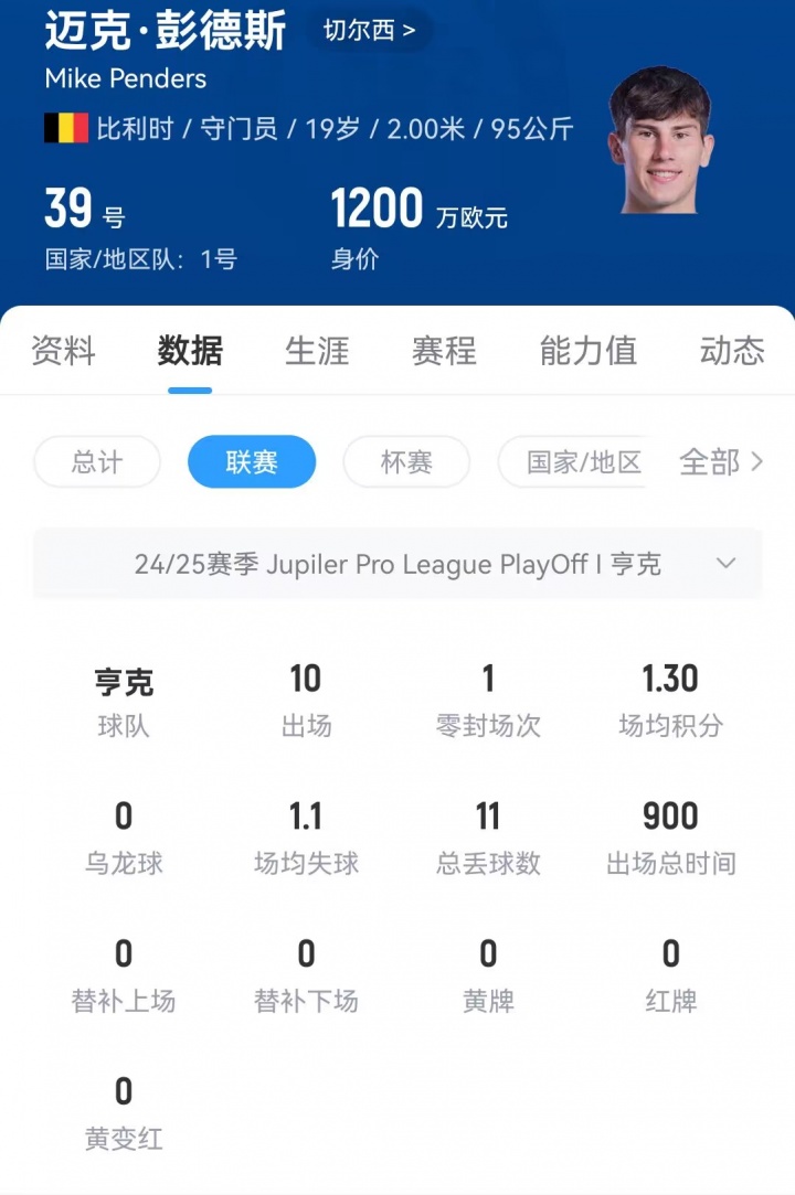 19歲的比利時門將邁克-彭德斯,2024年夏窗以2000萬歐元的轉(zhuǎn)會費(fèi)加盟切爾西,隨后被回租給亨克一個賽季。
