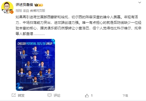 他寫道:“如果再引進荷蘭國腳西蒙斯和哈托,切爾西的陣容深度的確令人羨慕。年輕有活力,中場掃蕩能力突出,進攻端創(chuàng)造力強。唯一有點擔心的就是后防線缺少一位經(jīng)驗豐富的核心,據(jù)說俱樂部仍然想轉讓小查洛巴,但個人覺得他比科爾維爾、托辛等人都靠譜.............. ???”