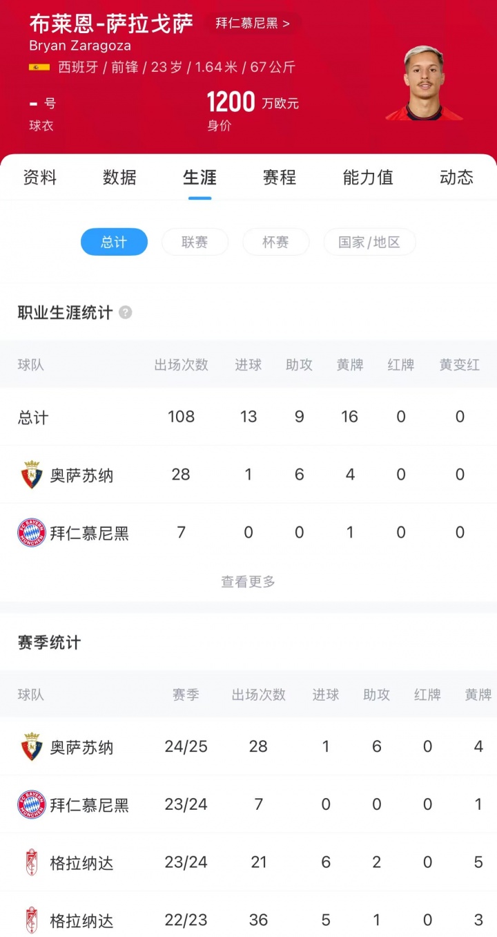 薩拉戈薩2023年2月從格拉納達轉(zhuǎn)會至拜仁,共計為拜仁出場7次。上賽季被租借至奧薩蘇納,出場28次,打進1球助攻6次。