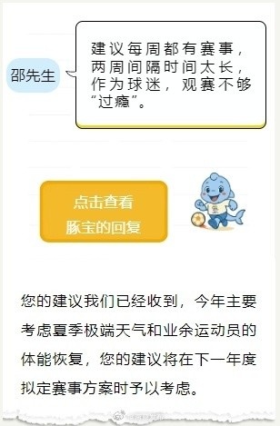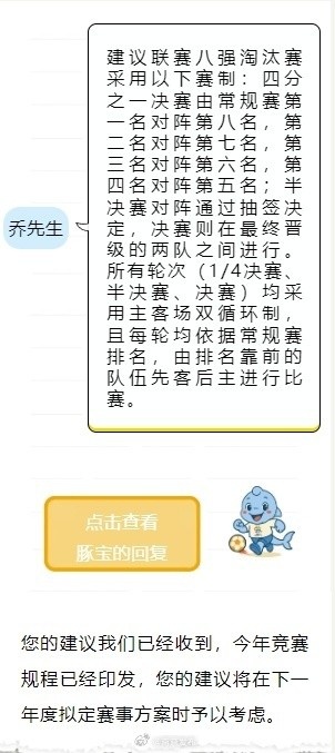 針對網(wǎng)友每輪賽事兩周間隔時間太長、關(guān)于八強產(chǎn)生后的淘汰賽制的建議,蘇超官方回復時均表示“您的建議將在下一年度擬定賽事方案時予以考慮”。
