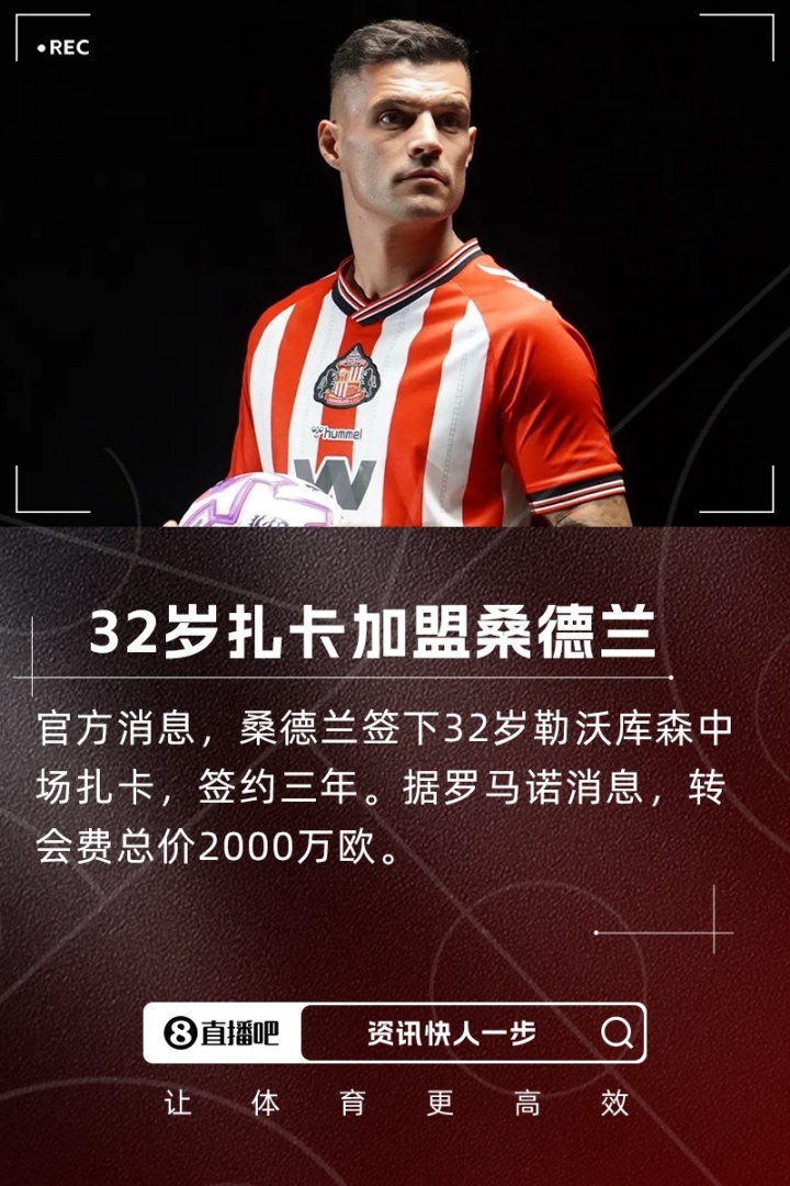 07月30日訊 桑德蘭官方宣布,簽下32歲勒沃庫森中場扎卡,簽約3年,他將身披34號球衣。據(jù)羅馬諾此前消息,轉(zhuǎn)會費為2000萬歐。