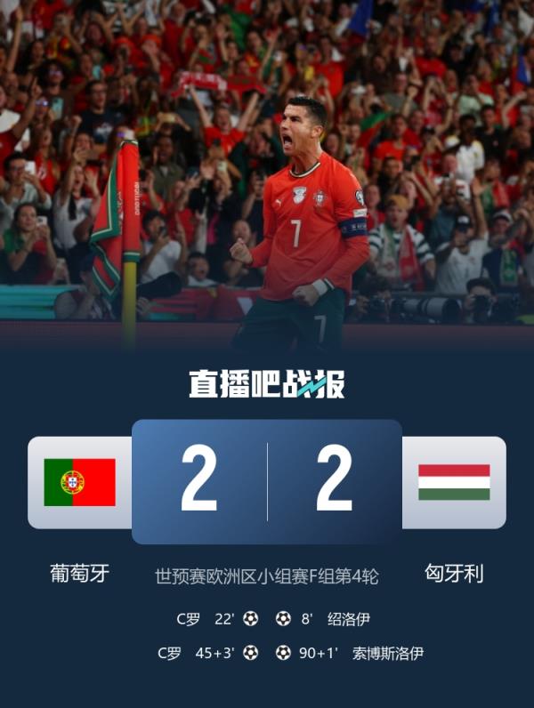世預(yù)賽歐洲區(qū)小組賽F組第4輪,葡萄牙2-2匈牙利,無緣本輪晉級(jí)世界杯正賽,C羅梅開二度。