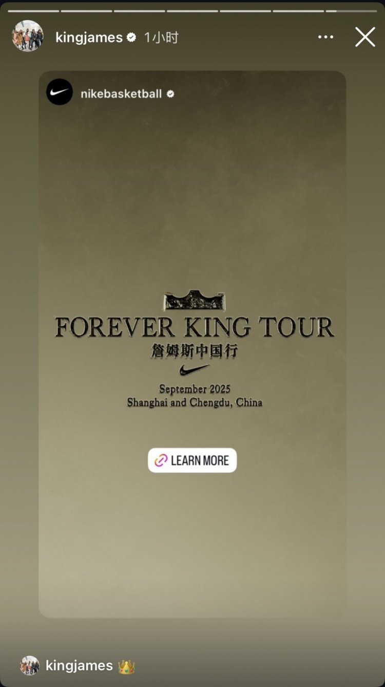 詹姆斯轉(zhuǎn)發(fā)了耐克籃球官方Instagram發(fā)布的詹姆斯2025年中國(guó)行的官宣動(dòng)態(tài),并評(píng)論了??的表情。