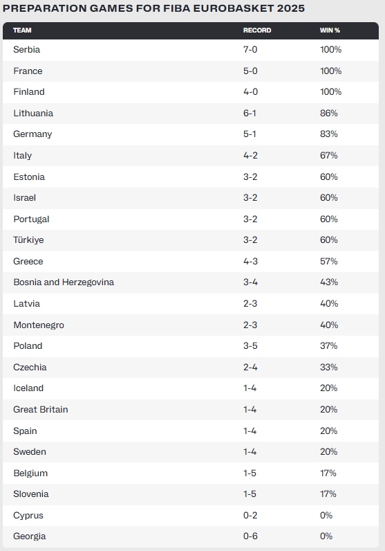 08月25日訊 2025年歐錦賽將于8月27日開打,各國球隊也已打完了全部熱身賽。