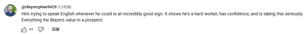 他一有機會就努力說英語,這是一個非常好的跡象,說明他很努力,很自信,而且很認真的對待這件事,這正是開拓者看重的潛力球員的特質(zhì)。