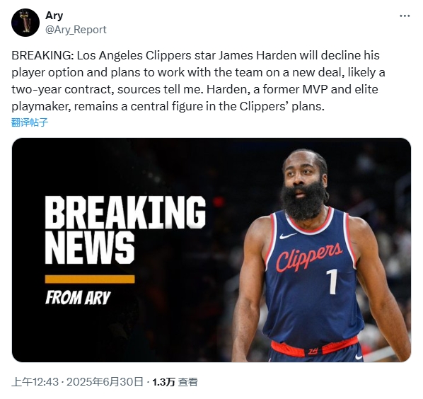 Ary報道哈登計劃與快船簽訂一份兩年的合同