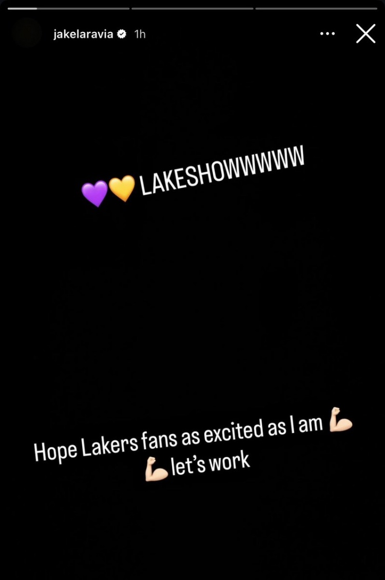 隨后,拉拉維亞更新了社交媒體,寫道:“????湖人秀!希望湖人球迷和我一樣興奮??!一起沖吧!”