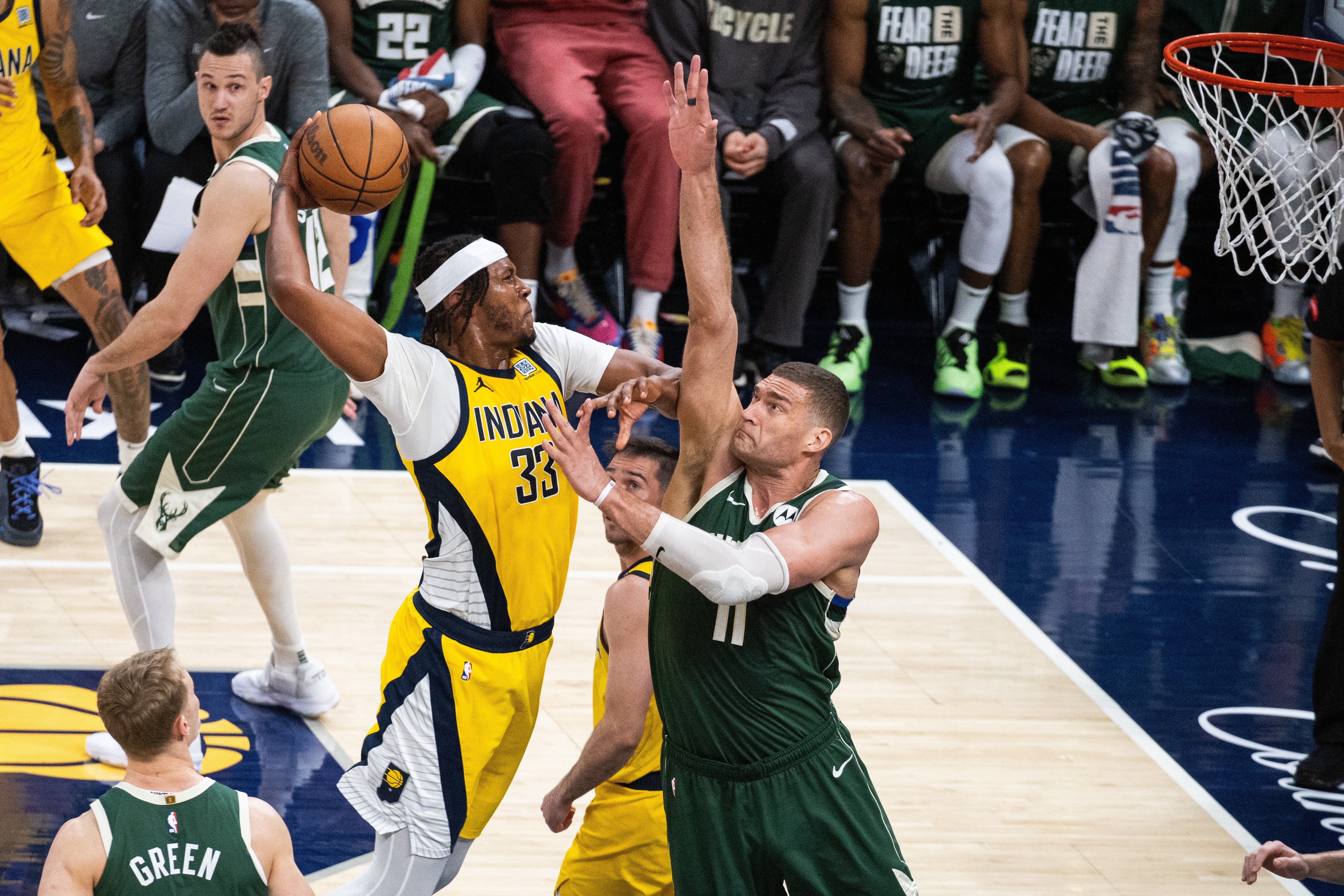 特納的防守上限略遜于大洛佩斯,他最高僅位列年度最佳防守球員票選第五,而大洛佩斯在2022-23賽季高居第二。但在西亞卡姆加盟前,特納常需獨自承擔步行者禁區(qū)守護者的角色,他從未與字母哥這般強悍的協(xié)防者搭檔過。根據(jù)GeniusIQ網(wǎng)站對NBA高階數(shù)據(jù)的追蹤,本賽季對手在距離籃筐五英尺內面對腳步放緩的大洛佩斯時,命中率反而略高于面對特納的表現(xiàn)。
