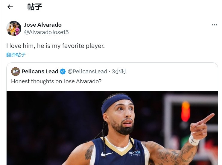 事情是這樣的,鵜鶘自媒體@Pelicans Lead 今天發(fā)問:“你對阿爾瓦拉多真實的想法是什么?”阿爾瓦拉多轉(zhuǎn)發(fā)了@Pelicans Lead 的這條動態(tài),并在旁邊寫道:“我愛他,他是我最喜歡的球員?!?/p>