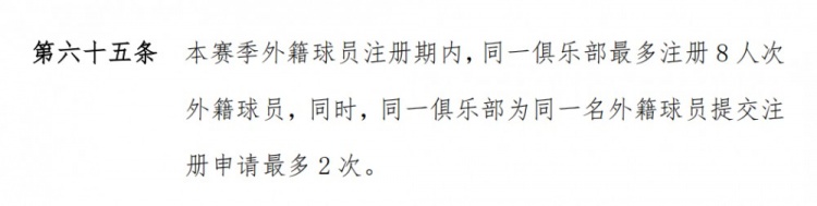 根據(jù)這份文件,各隊(duì)新賽季不能再像上賽季那樣無(wú)限次更換外援,在注冊(cè)期內(nèi),一支球隊(duì)除了最多只能注冊(cè)8人次外援之外,對(duì)同一名外援的注冊(cè)最多也只能兩次。