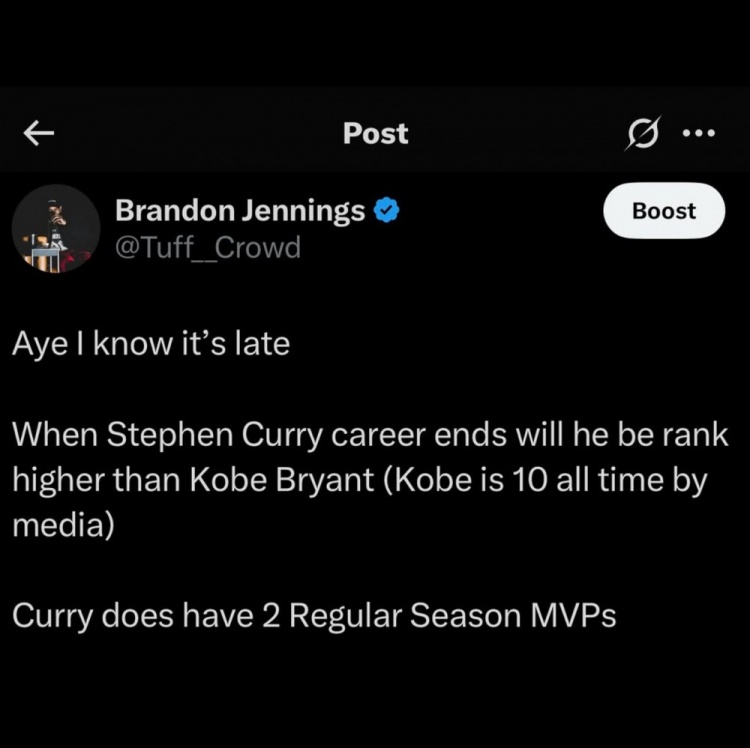 詹寧斯表示:“當(dāng)庫(kù)里退役的時(shí)候,他的歷史排名將高于科比(媒體將科比排在歷史第十)。庫(kù)里確實(shí)有兩個(gè)常規(guī)賽MVP?!?/p>