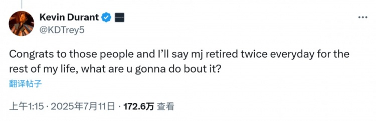 杜蘭特回復(fù):“祝賀那些人,在我的余生中,我會(huì)每天都說MJ退役了兩次,你能拿我怎么樣?”