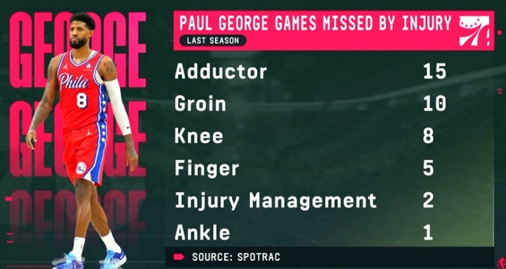 在2024-25賽季,喬治因傷病缺席了41場比賽: