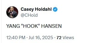 比賽末節(jié)楊瀚森利用腳步單打奎因得手,開拓者隊記Casey Holdahl發(fā)推感嘆道:“楊‘天勾’瀚森。”