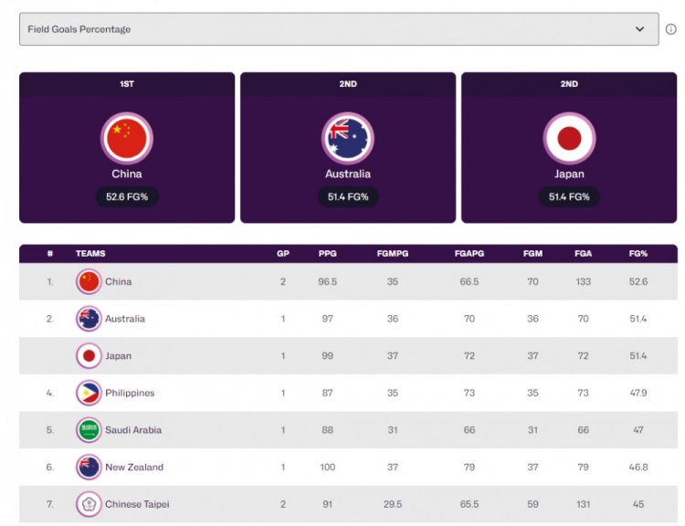 據亞洲杯官網統(tǒng)計,中國男籃2場過后的投籃命中率高達52.6%,暫列第1位!澳大利亞和日本同為51.4%,并列第二。