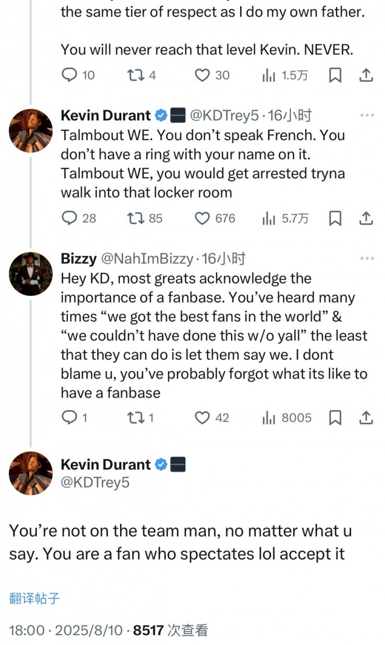 球迷B(昵稱為“Bizzy”):“KD,大多數(shù)偉大的球員都承認(rèn)球迷的重要性。你聽過很多次‘我們擁有世界上最好的球迷’以及‘沒有你們我們做不到’。他們至少可以說“我們”。我不怪你,你可能已經(jīng)忘了擁有球迷的感覺?!?/p>