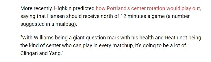 Highkin表示楊瀚森下賽季每場比賽可能獲得超過12分鐘的上場時間,他說:“由于羅威的健康狀況存在很大不確定性,而里斯又不是那種能勝任所有對位的中鋒,因此克林根和楊將承擔大部分任務?!?/p>