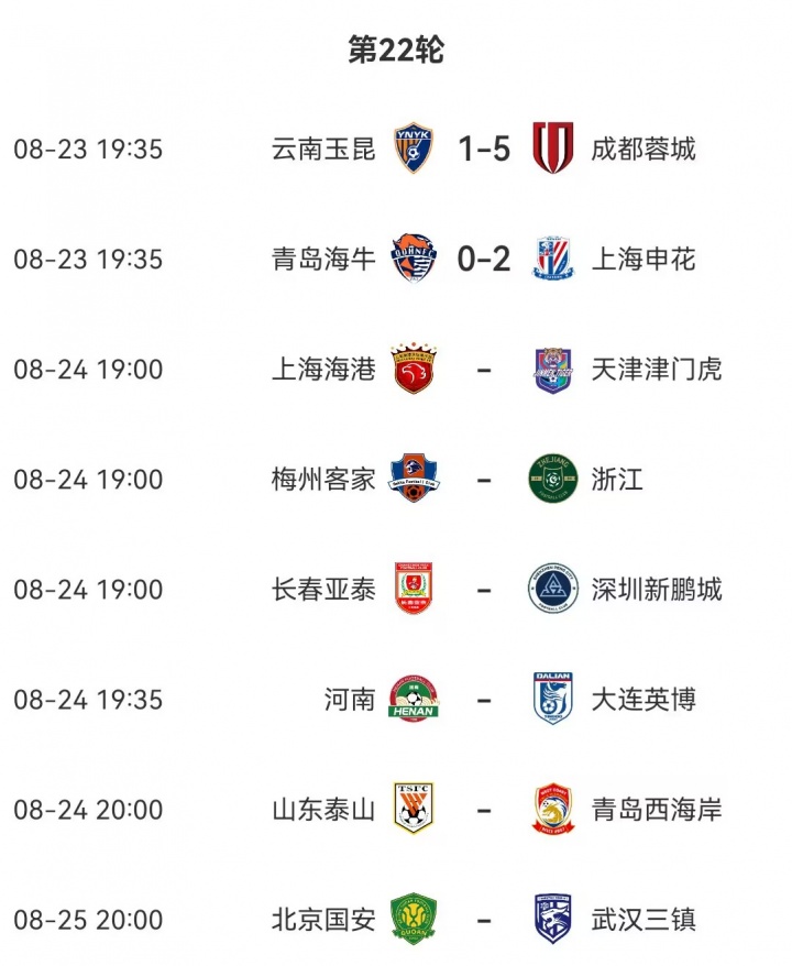 08月23日訊 中超第22輪的前兩場比賽結(jié)束,蓉城5-1客勝玉昆,申花2-0客勝海牛。