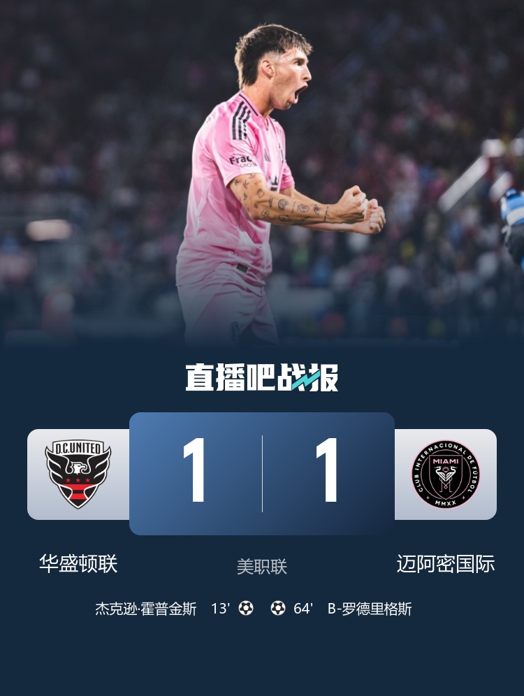 全場比賽結(jié)束,邁阿密國際客場1-1戰(zhàn)平華盛頓聯(lián)。