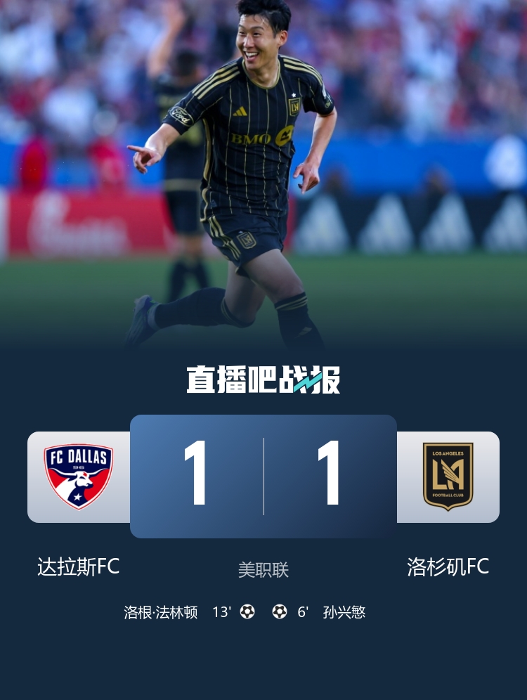 08月24日訊 美職聯(lián)達拉斯FCvs洛杉磯FC,孫興慜任意球破門,洛根-法林頓扳平比分,下半場博安加中框,最終洛杉磯FC與對手1-1握手言和。