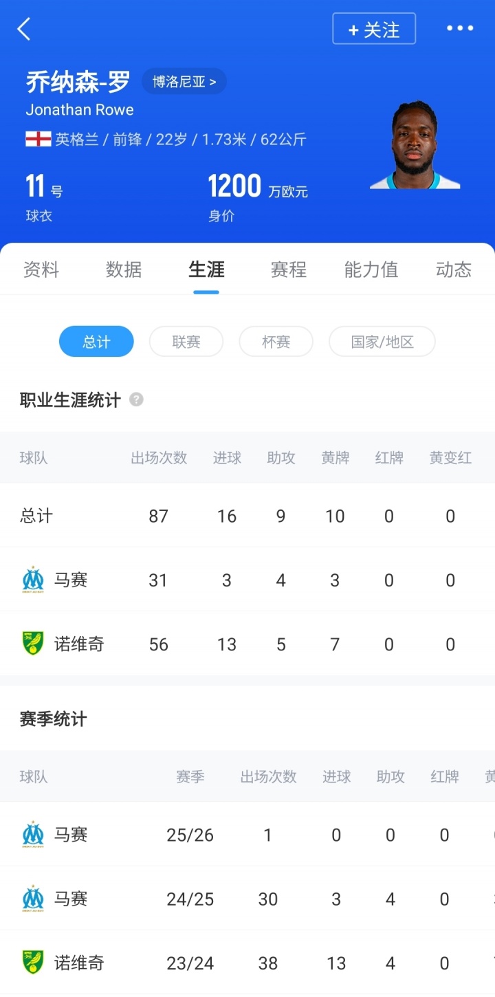 喬納森-羅,現(xiàn)年22歲,英格蘭前鋒,上賽季外租至馬賽,出戰(zhàn)30場(chǎng)比賽,打進(jìn)3球,助攻4次,并于賽季末1450萬(wàn)歐被馬賽買斷。