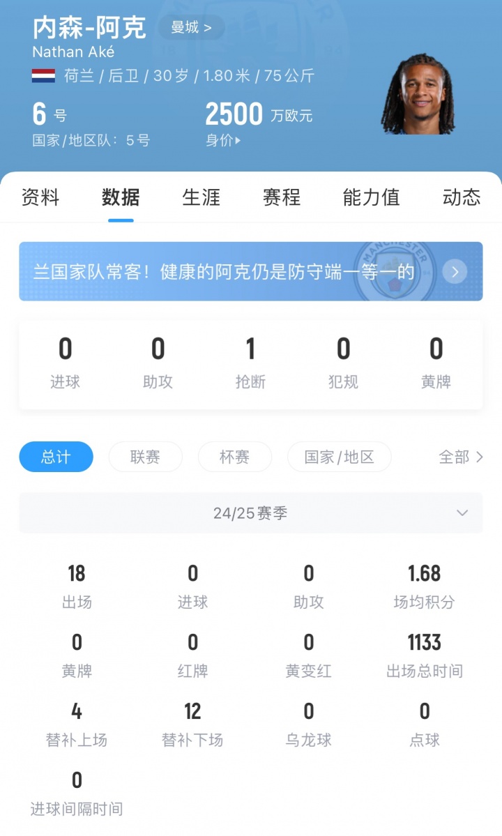 阿克現(xiàn)年30歲,他上賽季共為球隊出場18次,總計1133分鐘,目前德轉(zhuǎn)身價為2500萬歐。