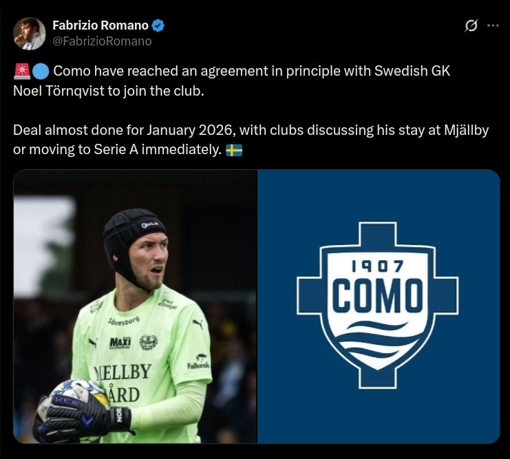 8月25日訊 據(jù)知名轉(zhuǎn)會專家羅馬諾報道,科莫已經(jīng)與瑞典門將諾埃爾-托爾奎斯特達成原則性一致。