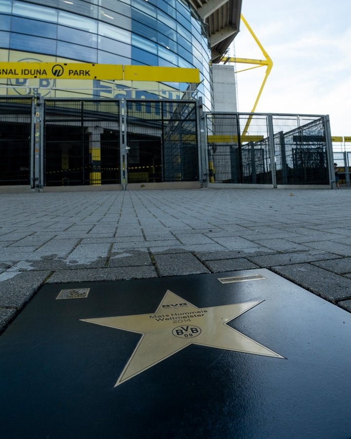 這塊鑲有金色星星、刻著“馬茨-胡梅爾斯”及“2014年世界冠軍”字樣的黑色石板,已被嵌入北看臺(tái)前廣場(chǎng)的地面。